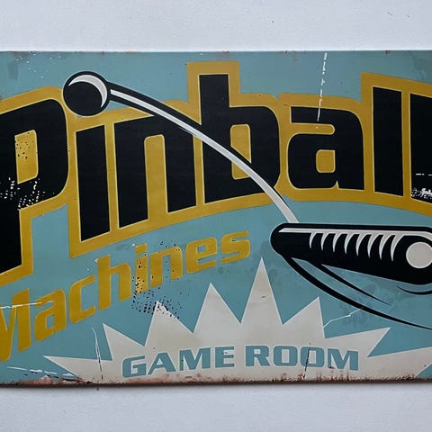 PINBALL Flipperspel plåtskylt med texten "Pinball Game Room - Open Daily" Skylten har en retrostil.