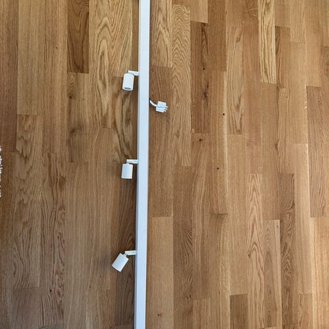 IKEA spotlightsskena 365+ Sända med 4 riktbara spotlights. Har utgått. Snygg design. Total längd ca 230 cm. (Går även att koppla isär till två 1 meters.)