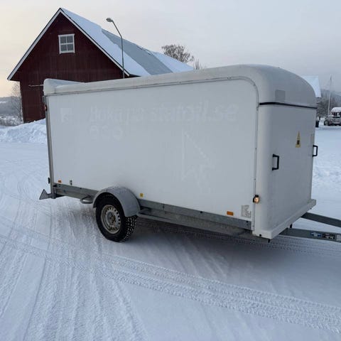 Nu är det färdigflyttat för den här gången och släpet får gå vidare till någon behövande. Invändiga mått: höjd 2 m, bredd 1,55 m, längd 3,7 m. Sitter bra dubbdäck på. Besiktad till 2027-03-31. Årsskatt 360 kr. Äldre handske på släpet, adapter till ny handske och kabel följer med. Släpvagnen har en bakre ramp för lastning och ett slutet skåp för skyddad transport. Användbar för att transportera olika typer av gods och utrustning.