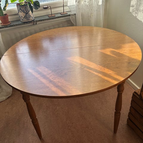Mindre ytliga repor i finishen på bordsskivan. Benen går att slipa om man vill förbättra finishen på dem.