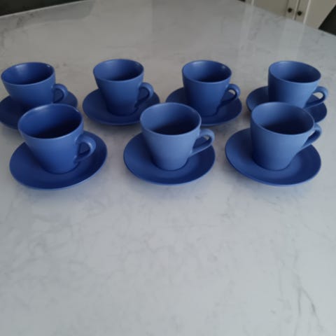 Vit kaffeservice med guldkant i tunt porslin. 12st assietter, 11st koppar med fat, 1st sockerskål med lock, 1st kaffekanna med lock, 1st gräddkanna.