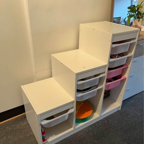 Hyllorna är stabila och i gott skick, perfekta för att organisera barnrummet. De säljs monterade och klara, vilket sparar dig både tid och skruvande!