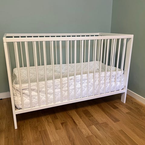 IKEA spjälsäng i vit trä, ”Gulliver”. Går att ställa i flera olika höjder, och det går att plocka bort ena sidans spjälor för ett barn som ska gå i och ur sängen själv! Allt i bilderna ingår;