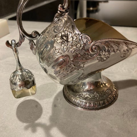 Silver skål med vågiga kanter . Det finns inga stämplar på skålen . Kan vara annat material då . Fint skick . Höjd 13 cm . Omkrets 18 cm . Använd som gräddskål , godisskål , sås skål mm . Får jag den inte såld så smälter jag ner den .