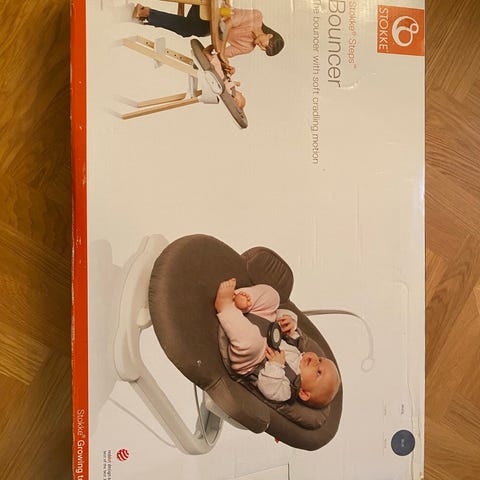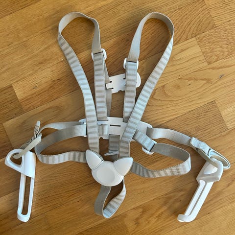 Stokke Barnstolar tillbehörset bestående av sittdyna, säkerhetssele och leksaksarm. Färgen är beige och materialen är textil och plast. Passar för barnstol.