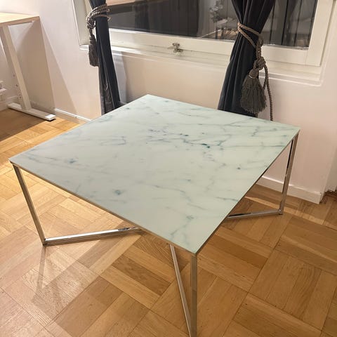 Soffbord rund med glasskiva marmormönster och svart metallram