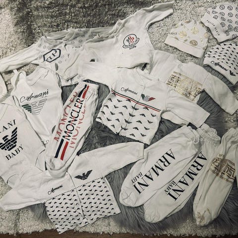 2 st pyjamas, 3 bodys, 1 set, 2 pikéer, 2 långärmade tröjor, 1 par jeans och ett par byxor. Kläderna kommer från Newbie, HM, Zara och Cubus.