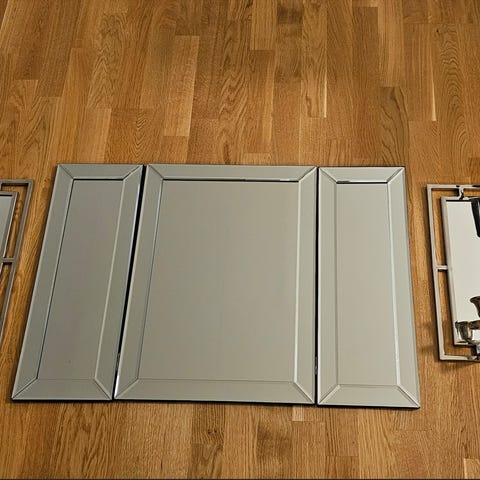 Säljer vår badrumsspegel pga renovering. Fin spegel med fasadekanter (svårt att få på bild) som skapar en diskret inramning. Spegeln har dubbla beslag på baksidan, vilket gör att det går att ha på vilken diagonal man önskar. Väggbeslag/fästen ingår.