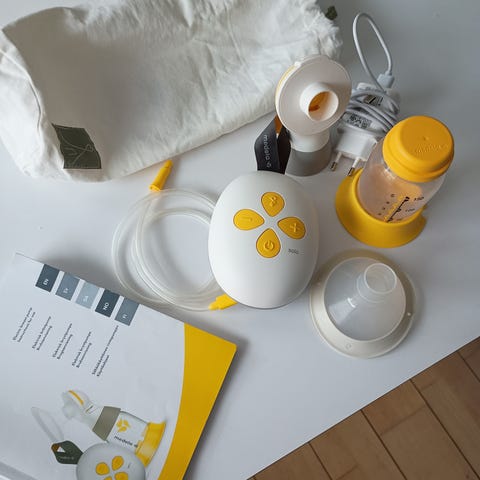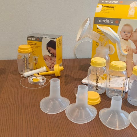 Medela Harmony Pump & Feed Set med handpump, flaskor och tillbehör. Setet är utformat för manuell pumpning och matning av bröstmjölk. Innehåller delar för enkel rengöring och användning.