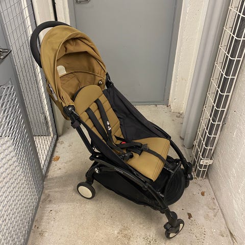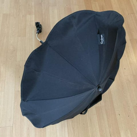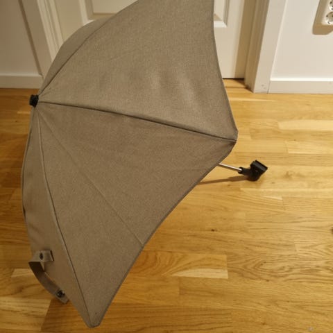 Stokke parasol/paraply i grått melerat tyg. Passar för sol och som regnskydd :)