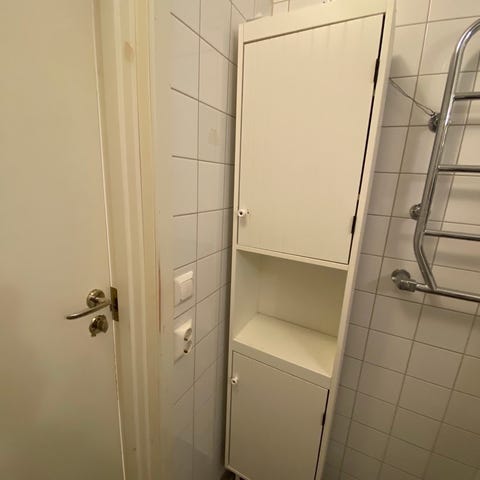 Spegelskåp i vit färg med inbyggd belysning. Skåpet har spegelyta fram och flera hyllplan för förvaring. Passar för badrum eller liknande utrymmen där spegel och förvaring önskas. Mått