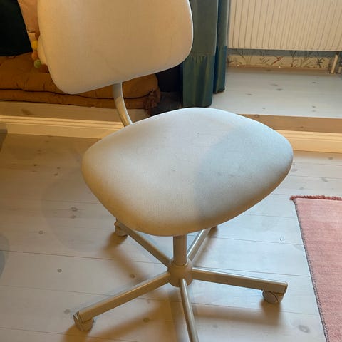 Kontorsstol i vit färg med hjul. Stolen har en enkel design med hål i ryggstödet för ventilation. Justerbar höjd och fem hjul för rörlighet. Passar för kontors- eller skrivbordsarbete. Perfekt för juniorrummet