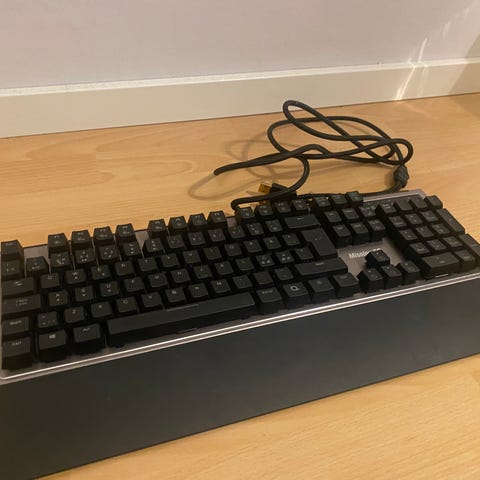 Gamingtangenbord V.7 Keyboard från Cyborg med RGB. Programmerbara knappar (12st) och touchknappar för ljud-, ljus- och musikhantering. Välanvänt men i mycket fint skick. Finns handledsstöd till (ena clipset har gått av, men ligger fint på plats ändå), som syns på bilderna.