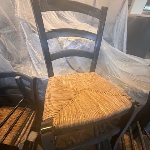 Säljer 4 st trästolar, svartbetsade, går att klä om, begagnade i bra skick, säljes alla 4 för 350 kr.
