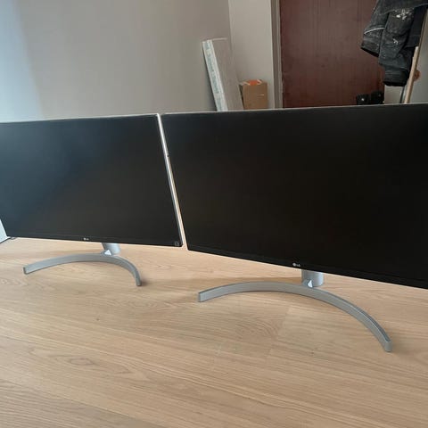 Dubbla skärmarmar avsedda för montering på skrivbord. Har använt för två 27" skärmar. VESA 100x100 eller 75x75. Armarna är justerbara.