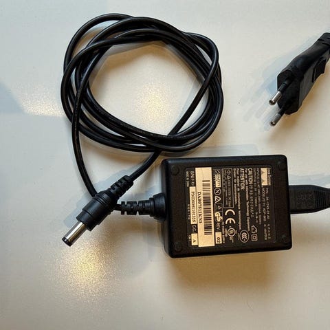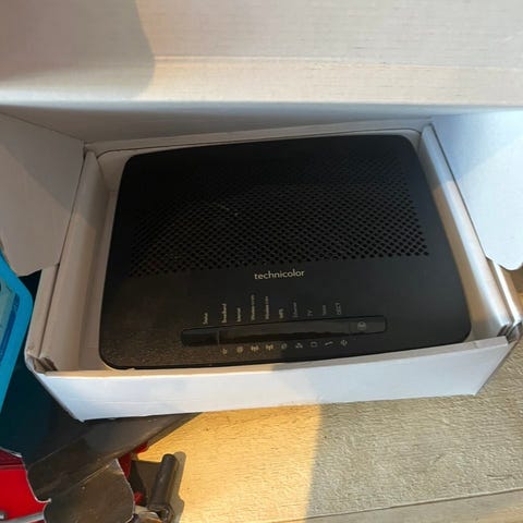 Sagemcom boxer med tillhörande strömadapter. Produkten har en svart perforerad design och levereras med originalförpackning.