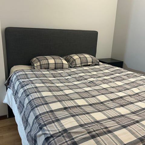 IKEA säng med bäddmadrass och huvudgavel i mörkgrå färg.