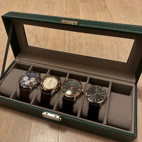 Brun klockbox med plats för flera klockor. Perfekt för att förvara och skydda dina klockor.