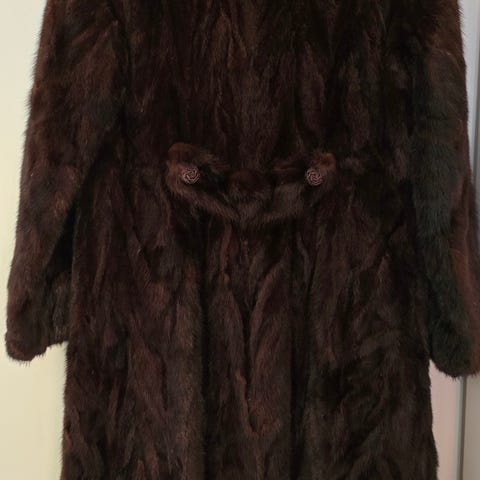 Äkta minkpäls, brun, sparsamt använd. Drygt 90 cm lång.