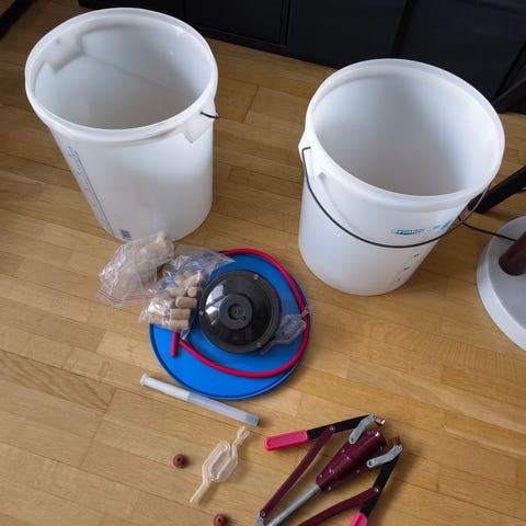 Göra Eget Vin press i trä och metall med tillhörande tillbehör inklusive hinkar, korkar, slangar och verktyg för vinframställning. Produkten är avsedd för hemmabryggning av vin. Endast använt vid ett tillfälle tidigare.