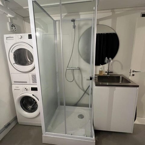 Showerama 10-5 duschkabin med måtten 90x90 cm i vit färg. Utrustad med flera duschmunstycken inklusive takdusch och handdusch. Kabinen har reglage för vattenflöde och temperatur. Passar för installation i badrum som kräver en kompakt duschlösning.