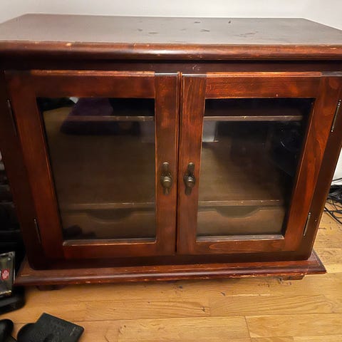 Någon mörkare faner. Ett par små skador upptill längst fram där spånskivan är blottlagd, men syns inte på håll.
