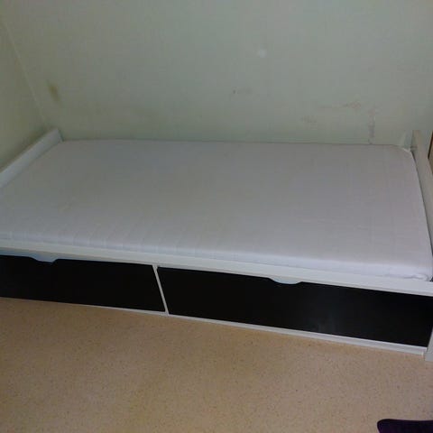 Vit säng 90x200 cm med två svarta rejäla lådor under.