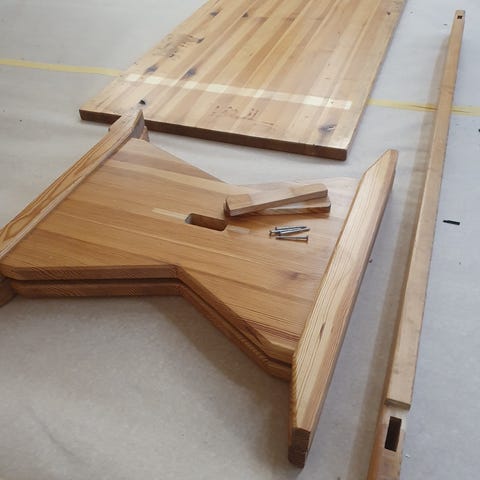 Äldre matbord med bordsskivan i trä (naturlig) och ben målade i ljusgrön matt mineralfärg.