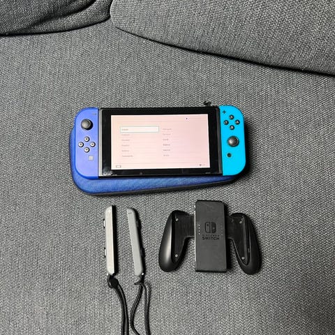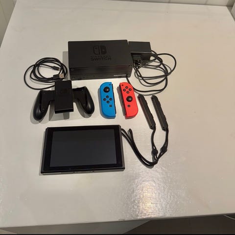 Nintendo Switch V2 spelkonsol med röda Joy-Con-kontroller. Konsolen har en pekskärm och kan användas både som bärbar och stationär enhet. Medföljer dockningsstation för anslutning till TV, laddare, handkontroller, hörlurar och diverse kablar. Passar för spel på Nintendo Switch-plattformen o tv ,