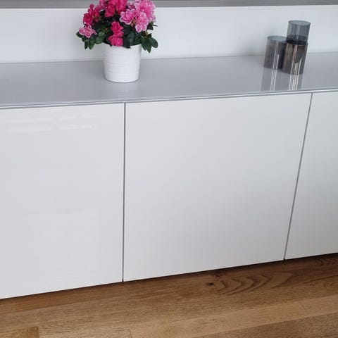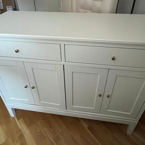 Säljer en stilren vit skänk i gott skick. Den har en modern och enkel design som passar lika bra i vardagsrum som i sovrum eller hall. Skänken består av två separata delar som kan stå tillsammans som en lång enhet eller användas var för sig, vilket gör den flexibel beroende på utrymme och behov.