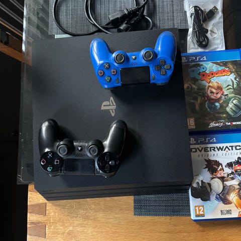 Svart PlayStation 4 Pro, 1TB lagringsutrymme och två original PlayStation kontroller med laddstation.