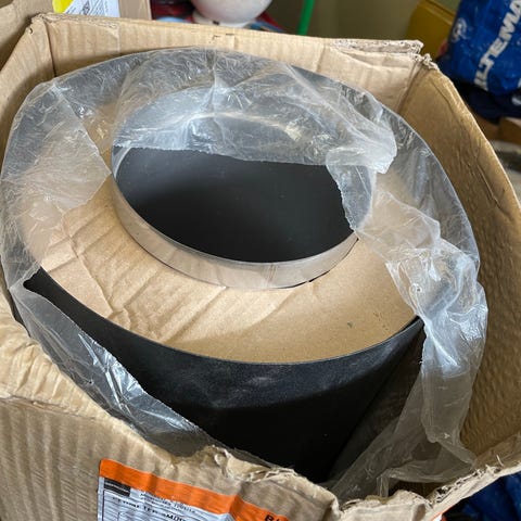 rördel i svart stål med 90 graders vinkel med sot. Rördelen har en diameter på cirka 12 cm och är avsedd för användning i ventilations- eller rörsystem
