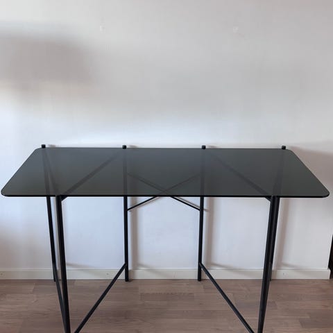 Skrivbordsskivan i frostat glas som ligger löst på de vita metallbenen.