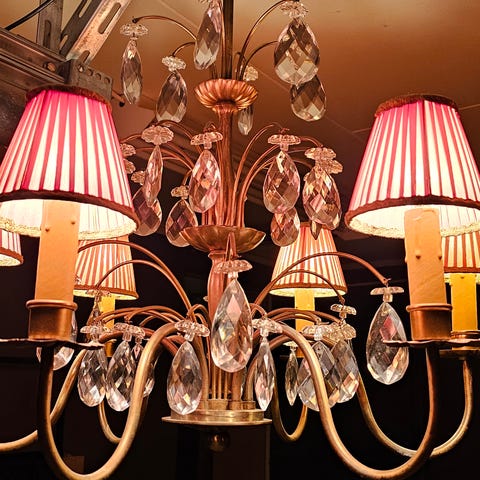 Sexarmad kristallkrona i barock stil med både elljus och hållare för levande ljus.