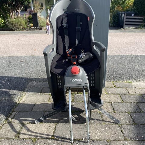 Barnsits i svart färg som monteras på cykel. Passar för att transportera barn säkert på cykeln. Tillverkad i hållbart material och utformad för att ge stabilitet och komfort under cykelturen. Ett fotstöd som gör det möjligt för ett barn att åka sparkcykeln framför en vuxen