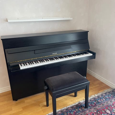 Upright piano i träfärgat utförande. Pianot har standardstorlek och är avsett för allmän användning.