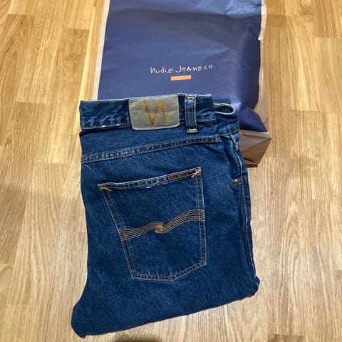 Säljer ett par mörkblåa Nudie Jeans i storlek W27 L32 i mycket bra skick! Riktigt sköna.