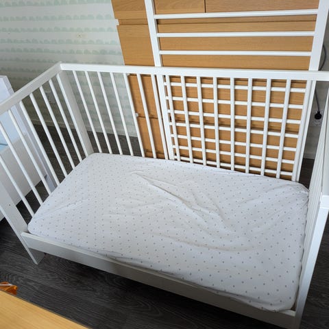 Madrass till spjälsängen kan ingå om man vill ha den, men den har två mindre fläckar som sannolikt går att tvätta bort.
