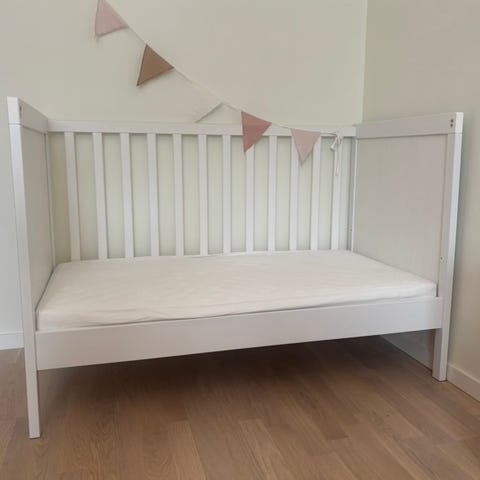 Sängen har en justerbar sängbotten och man kan även ta bort ena långsidan för att göra om sängen för äldre bebis