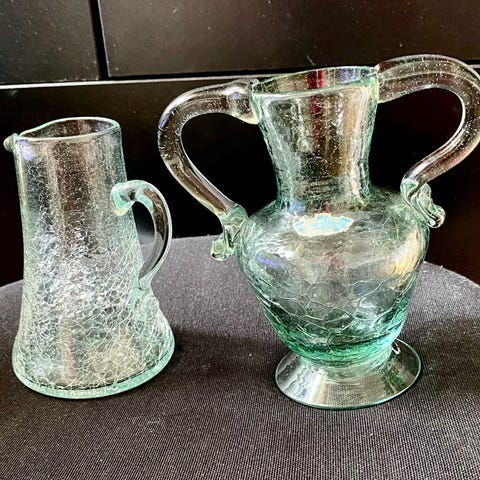 Detta är en grön krackelerad brännvinskaraff, även känd som "Skansenglas, design Ture Berglund