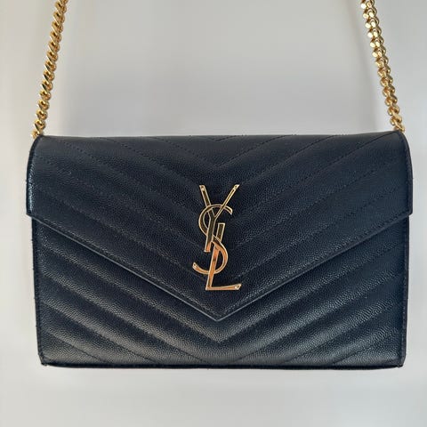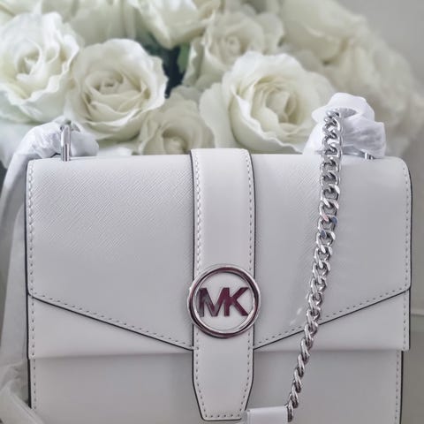 Stilren modell i slätt läder med guldfärgad MK-logotyp framtill och dekorativ kedja på framsidan. Praktisk insida med två fack som gör väskan lätt att organisera. Passar bra till både vardag och finare tillfällen.