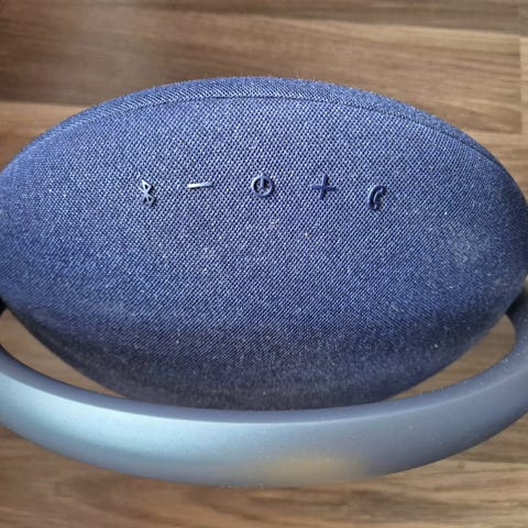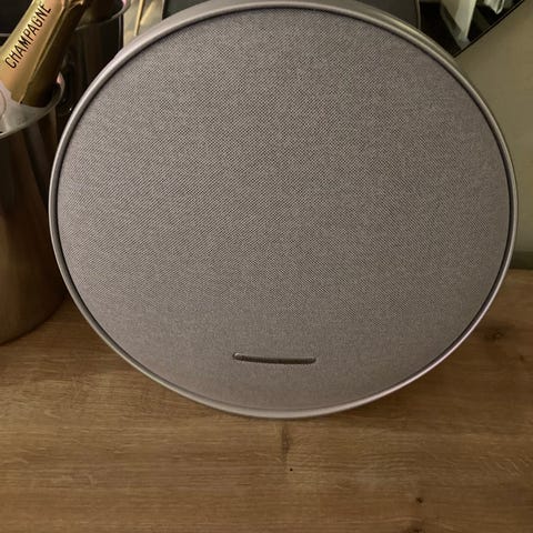 Harman Kardon Onyx Studio högtalare i grå färg. Rund design med inbyggt handtag för enkel bärbarhet. Tygklädd yta och trådlös funktionalitet för ljuduppspelning.