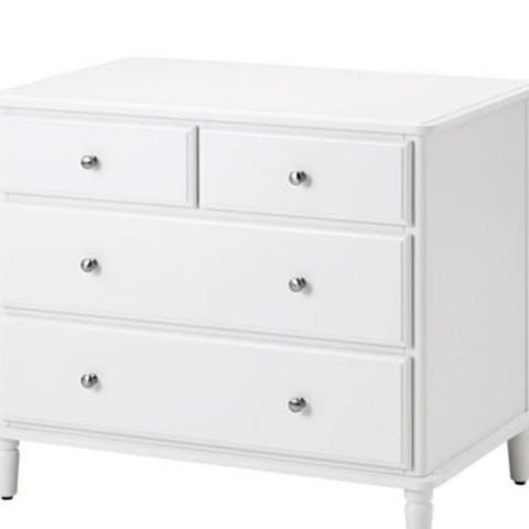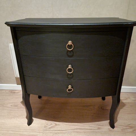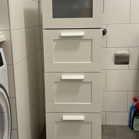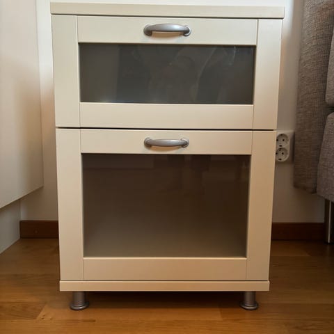 Är du ute efter en snygg och praktisk byrå med glasfronter på lådorna, då är detta byrån för dig. Lådorna har frostat glas på framsidan och metallhandtag och står på små ben. Byrån är i nyskick utan några skador eller skavanker, detta är ett fynd!