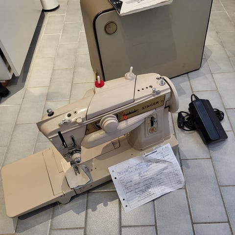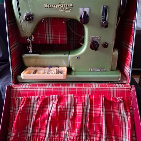 Husqvarna Automatic 21E symaskin i grön färg. Maskinen är mekanisk och levereras med strömkabel och fodral. Passar för sömnadsarbete och reparationer.