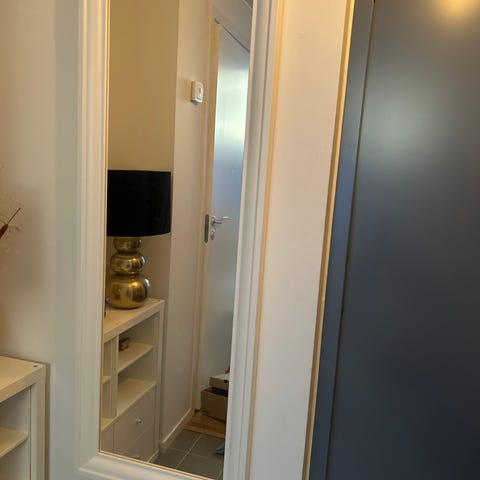 IKEA spegel med svart ram. Spegeln har en rektangulär form och en ram i svart färg. Passar för användning som helkroppsspegel i olika rum.