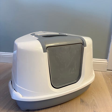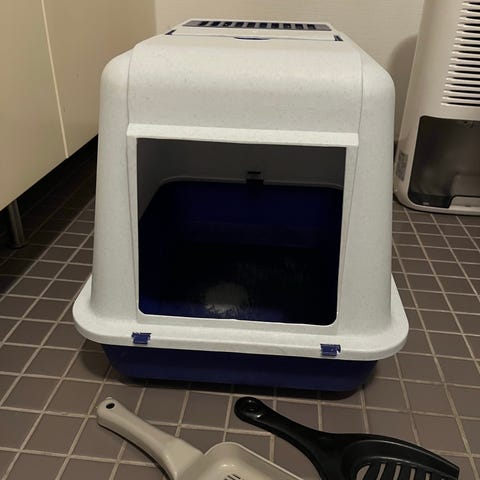 Stor, trekantig kattlåda med tak och ”dörr”. Blå. Bredd 66 cm, djup 52 cm och diagonalen ca 56 cm. ”Takhöjd” ca 44 cm. Europet Bernina.