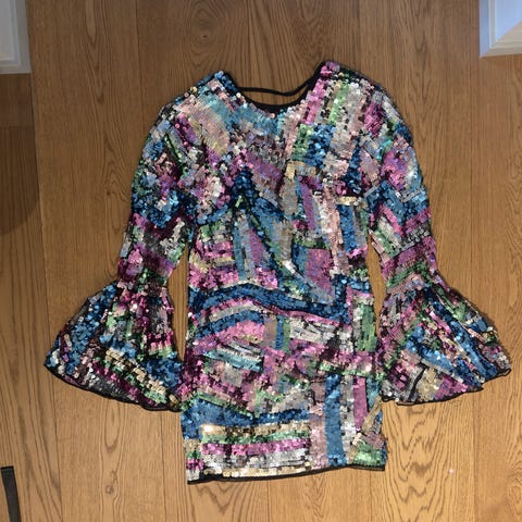 Klänning med meshparti i ryggen. Stretchigt material och dragkedja i sidan. Storlek XS, passar XS-S. Längd 84 cm från axel och ner. Endast provad!