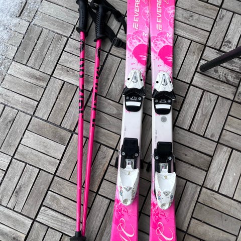 Salomon skidpaket för barn med längd 110 cm, inklusive bindningar. Skidorna har en färgstark design med blommönster.