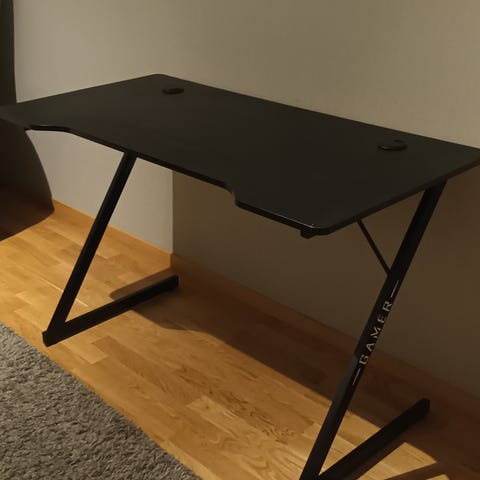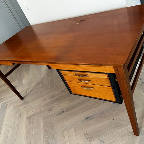 I fint skick, har ett litet skav på en av hyllorna och på skrivbordskanten se bild 7 & 8 kan finnas lite missfärgning på skrivbordsytan från pennor
