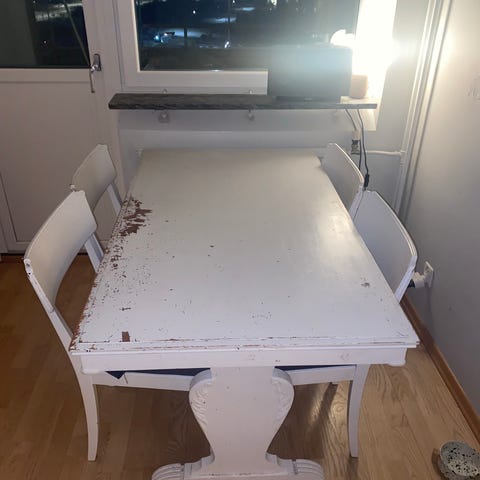 Flitig använt, flera skador i lack på bordskivan, bordsbenen, och stolarna. Behöver kärlek.